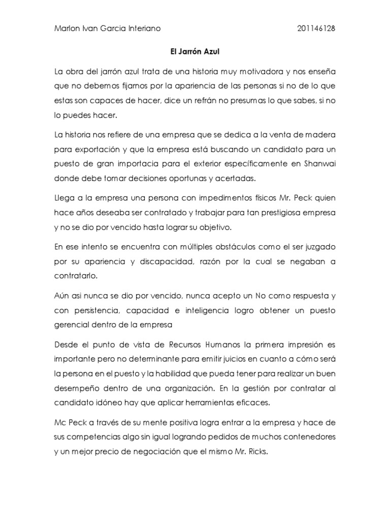 Peck con impedimentos físicos que tiempos atrás deseaba trabajar. En ese intento se encuentra con multiples obstaculos como el ser juzgado por su apariencia y discapacidad razón por la cual se negaban a contratarlo. INTRODUCCIÓN El personaje principal que describe el autor es una persona ejemplar acerca de la actitud que debemos tener de no darnos por vencidos sin importar los prejuicios.