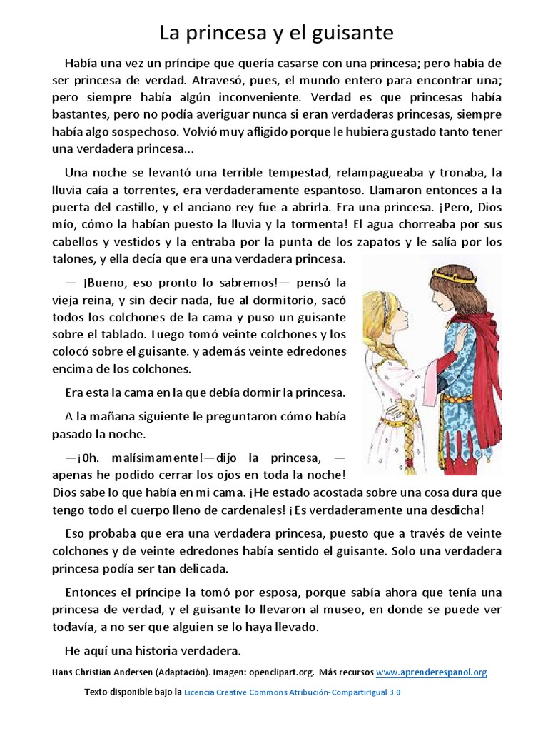 La princesa y el guisante Bilingual is a simplified text based on the fairy tale written by Hans Christian Andersen in 1835. Atravesó pues el mundo entero para encontrar una. Verdad es que princesas había bastantes pero no podía averiguar nunca si eran verdaderas princesas siempre.