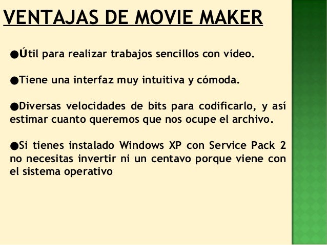 Es muy útil en la realización de trabajos sencillos con videos. Como editor de videos no lineal permite cortar desplazar y editar todos los elementos de video audio imagen y texto en cualquier orden. Ventajas 1Algunas de las ventajas de usar Windows Movie Maker es que si tienes instalado Windows XP con Service Pack 2 no.