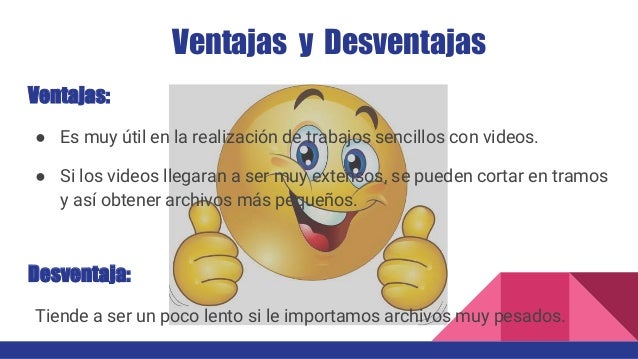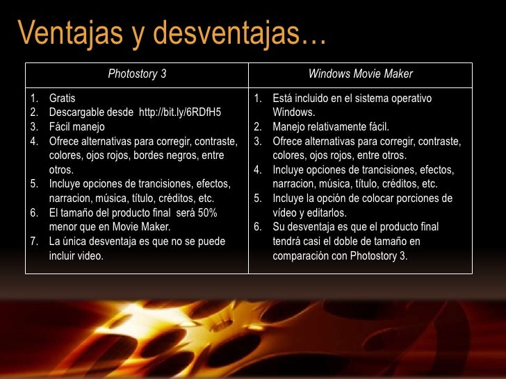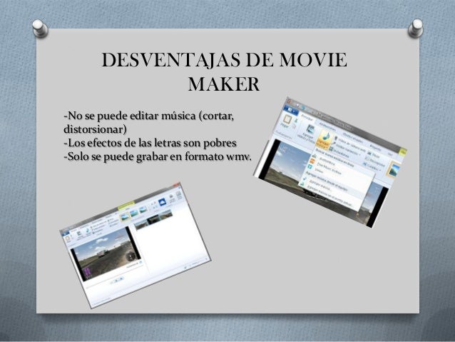 50 Desventajas Prohibiciones no funciona bien solo guarda en wmv. Ventajas y desventajas de moviemaker 1Algunas de las ventajas de usar Windows Movie Maker es que si tienes instalado Windows XP con Service Pack 2 no. Aunque elijas tú la tipografía y las imágenes o vídeos a editar no permite sino trabajar con efectos y títulos pre diseñados.